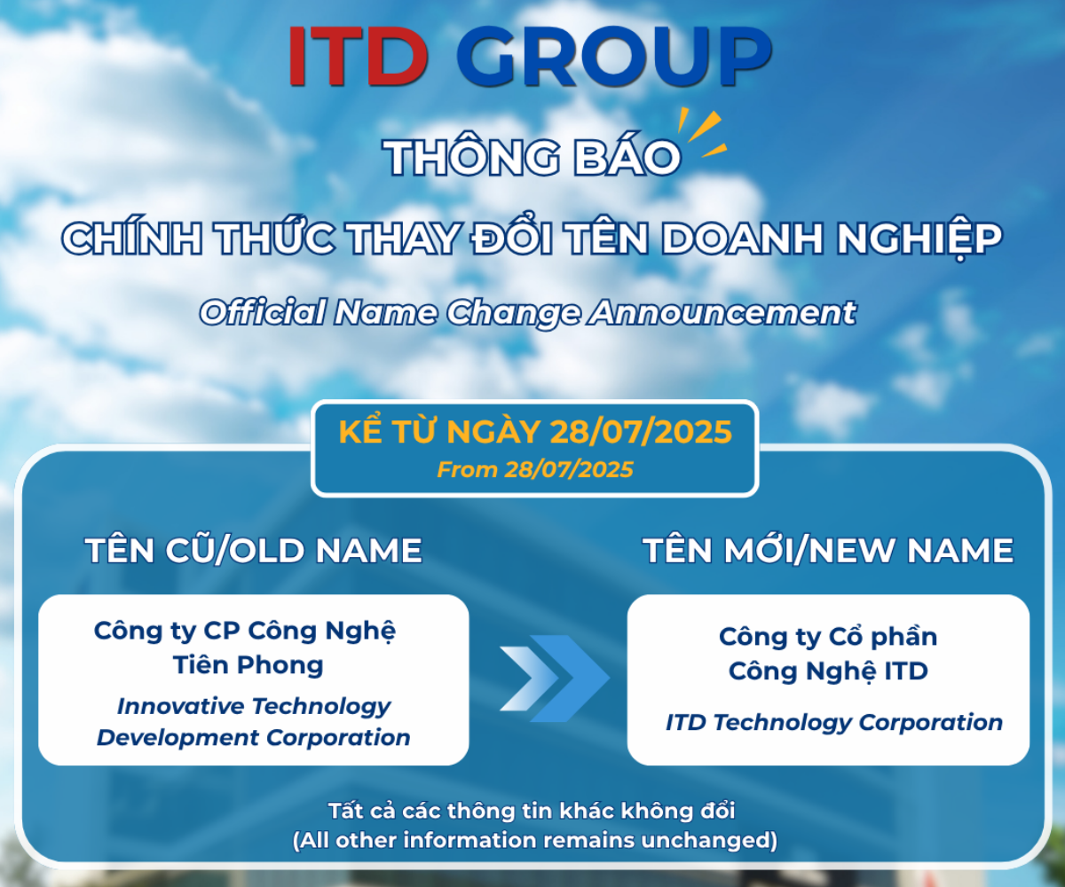 We are pleased to officially announce that, effective from July 28, 2025, Tien Phong Technology Corporation has been renamed to ITD Technology Corporation (CÔNG TY CỔ PHẦN CÔNG NGHỆ ITD).